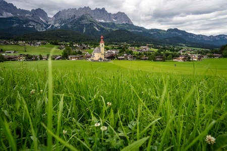 Yellow local church in Ellmau. Village of Going. Wilden Kaiser mountains in background. Tirol, Alps, Austria