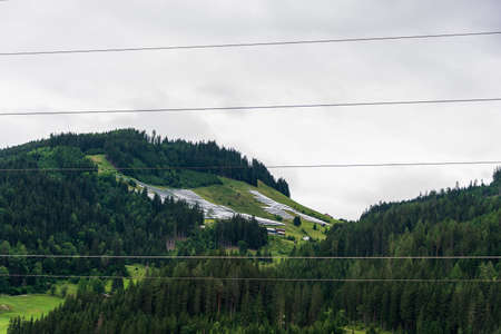 Solar park, photovoltaic power station located on a mountain slope in the Alps seen through high voltage overhead power line.