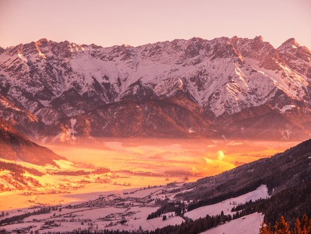 View to the Germand and Austrian Alps from german village Reit im Winkl on an early winter morning, copy space