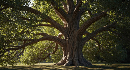 Majestic oak tree with sprawling branches and rough fissured trunk in lush green canopy