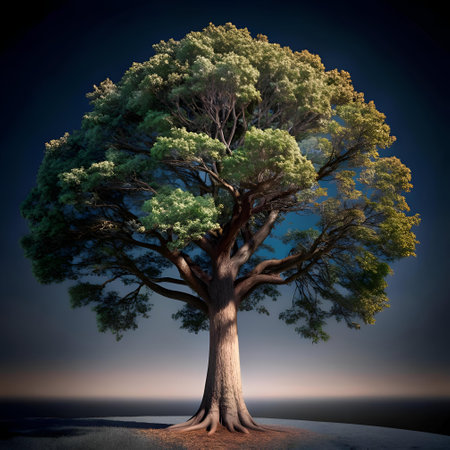 A majestic 3D rendered hickory tree stands tall against a twilight sky. Its branches spread wide. showcasing the intricate details of its bark and foliage. Perfect for nature themes. environmental illustrations. and more.