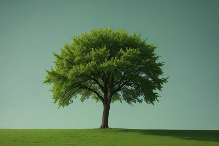 A solitary, lush green tree with a broad canopy stands prominently against a bright, clear sky, exuding a sense of tranquility and natural beauty.