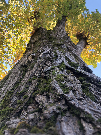 Tall tree in autumn with green moss and blue sky