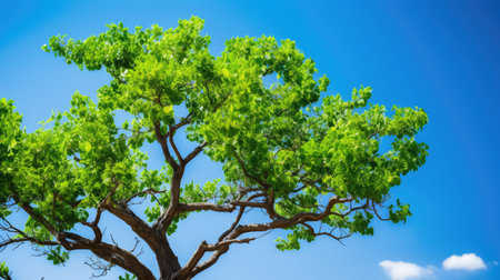 A striking perspective of a large tree captured from its base, showcasing the extensive network of branches and vibrant green leaves. The upward view reveals the tree's height against the sky, illuminated by sunlight. This image is suitable for various commercial uses, including environmental themes and nature-related content.