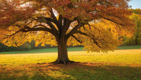 The image features a large tree with a canopy of golden leaves, basking in the warm light of the sun. The sky is a soft, clear blue, creating a beautiful contrast.