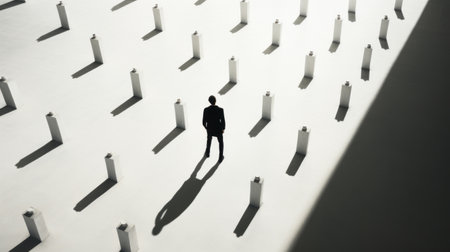 a businessman stands in the shadows of a dark room, illuminated by multiple lights. the scene resembles geometric minimalist sculptures with monochromatic white figures. the installation is life-sized, creating a captivating aerial view. the piles and stacks create bold shadows, enhancing the minimalist landscape. ai generated