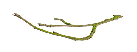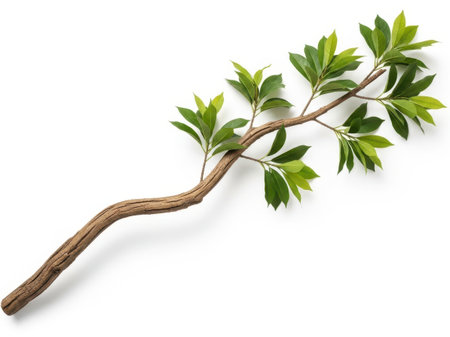 This image features a solitary brown branch adorned with vibrant green leaves, set against a clean white background. The branch is curved and twisted, adding a natural and organic feel to the composition. The contrast between the earthy tones of the branch and the bright green leaves creates a visually appealing effect, making it suitable for various design and decorative purposes.
