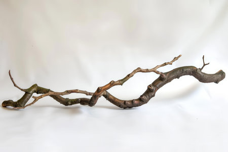 Unique, curved wooden branch isolated on a white backdrop, showcasing natural shapes and textures