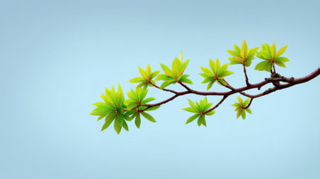 A vibrant depiction of fresh green leaves on a branch set against a soft blue background, symbolizing growth and tranquility, perfect for nature-themed projects.