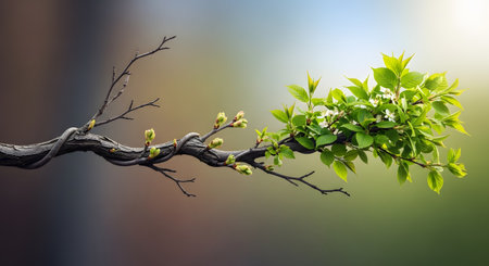 A single tree branch illustrates a powerful contrast and transition from a dead, bare section to a vibrant, living part bursting with fresh green leaves, buds, and white blossoms. Set against a soft-focus background, this image symbolizes rebirth, renewal, hope, spring, and the cycle of life.
