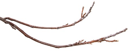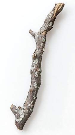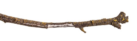 Single grey, rough tree branch with patches of lichen resting on a white background. This minimalist image is ideal for use as a design element and background.