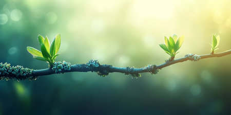Spring Awakening Fresh Green Leaves Budding on a Thin Branch, Backlit by Golden Sunlight