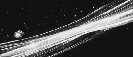 Dark, murky image of filamentous algae glowing like rungs on a ladder, in an abstract micrograph at 100x with polarization.