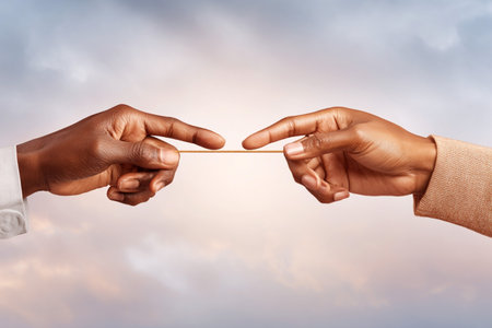 Two hands, one dark and one light, are pulling a thin string, representing connection and unity, set against a soft, cloudy background with warm tones