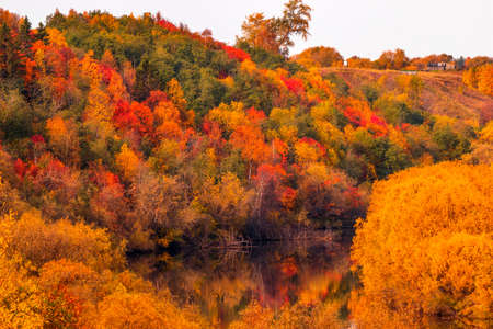 Autumn landscape with trees with bright foliage on the hillside. Autumn season