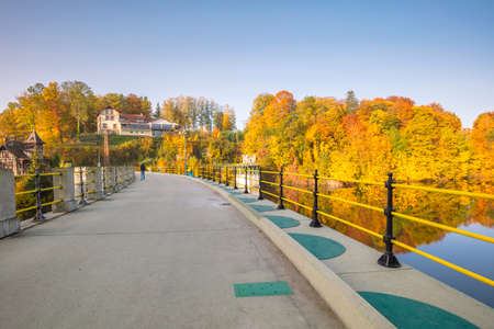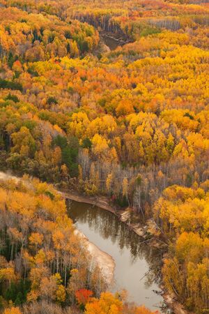 Autumn Landscape View of the Gauja River Surrounded by Forests Colorful Bright Yellow Orange and Green Trees, Sunny Day. Sigulda, Latvia During Golden Autumn Season in Latvia. Orange Forest.