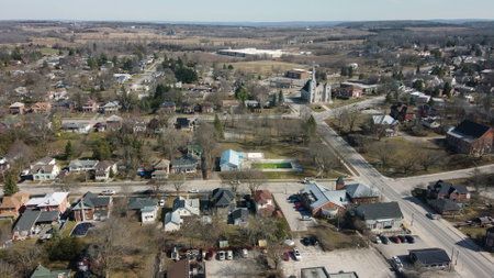 Streets of downtown Elora with beautiful old houses, narrow streets, lanterns and decorations. Tourist town of Elora, Ontario, Canada