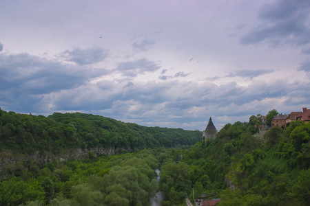 Panorama of river canyon Smotrych with ancient tower defense. National Historical and Architectural Reserve Kamenetz-Podolsk, Ukraine.