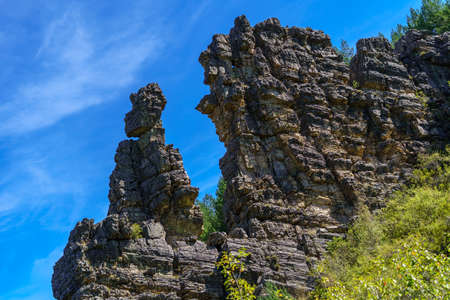 Terrific view of the River Canyon on a cloudy fall day. Buky Canyon on the Hirs'kyi Tikych river in Ukraine