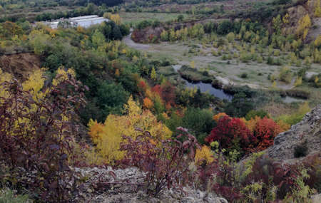 Autumn quarry landscape view from top. Colorful trees, bushes and nature. Limestone quarry in Czech Republic.