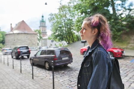 Young teenager girl in denim jacket on an autumn old city street, copy space