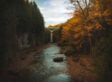 A dam on Wissahickon Creek and old railroad bridge, in Philadelphia, Pennsylvania.