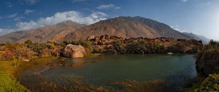 Central Asia. Tajikistan. A picturesque lake with swampy shores in a deserted mountain valley along the Pamir highway.