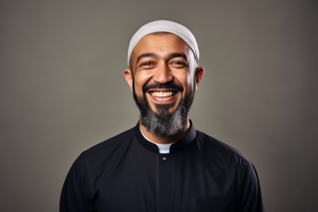 Portrait of a happy muslim man smiling at camera isolated over gray background