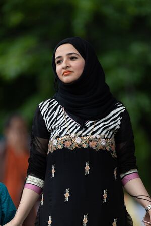 Grand Rapids, Michigan, USA - June 15, 2019: Asian Pacific Festival, Pakistani woman wearing traditional clothing at a fashion display in the Rosa Parks Circle