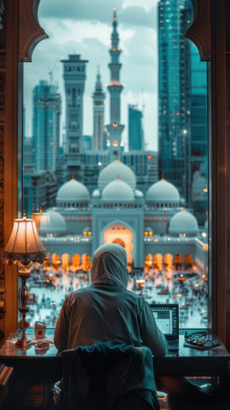 A Muslim woman is working on his laptop in front of a mosque. Ramadan Kareem background. Islamic holiday.