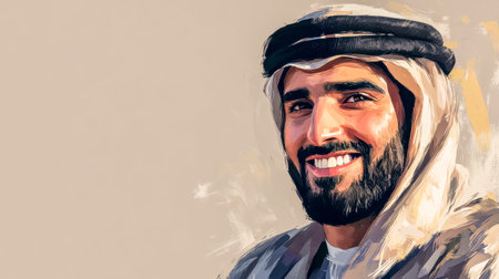 A captivating photograph ideal for cultural features, diversity campaigns, or as a respectful representation of Middle Eastern heritage | This image exudes warmth and friendliness, focusing on a man dressed in traditional Middle Eastern clothing, his smile exuding hospitality and openness. The impeccable white of his allure contrasts effectively against the blurred background of a modern, well-lit space, symbolizing the harmonious blend of tradition and modernity. The subject's smile and engaging eyes are sharp in detail, conveying a sense of genuine welcome that transcends cultural boundaries. His allure, characterized by a kandura and a neatly wrapped ghutra held in place by an equal, represents cultural identity and regional pride. The light cascading over the scene highlights its features, enhancing the texture of the fabric and the authenticity of the moment | Suitable for inclusion in travel brochures emphasizing cultural experiences, educational material about global attraction, or as a positive and inclusive image in corporate diversity and inclusion materials. The photograph could also be used by tourism boards or in a personal setting, serving as inviting wall art that reflects cultural richness and intercultural dialogue | a high-resolution photo of a smiling man in Middle Eastern dress, sharply focused against a soft-focus background, offering a narrative of cultural celebration under warm indoor lighting, ideal for overlaying text for articles or headlines