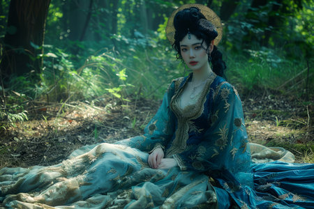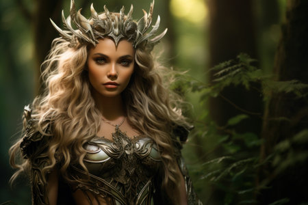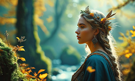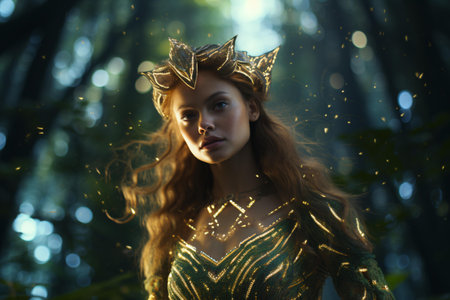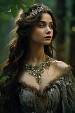 A beautiful medieval queen stands in a dense forest with a sunbeam falling on her face. Ancient legends. Fantasy world.