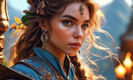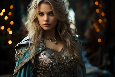 Beautiful red haired girl in metal medieval armor dress with sword standing in warlike pose and looking at camera with fearless. Fairy tale story about warrior. Warm art work.