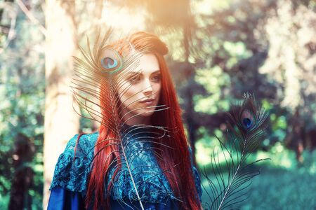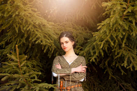 Celtic culture. Fantasy world. Portrait of a beautiful red-haired girl of the Middle Ages walking in the dense forest.