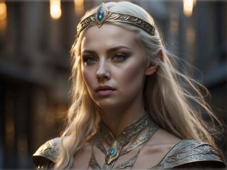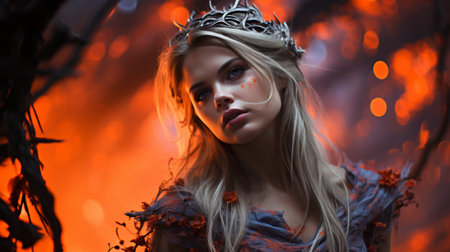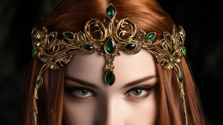 Fantasy world. Ancient legends. Portrait of a beautiful, majestic medieval queen on a dark background.