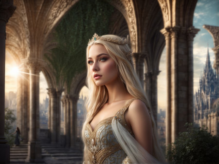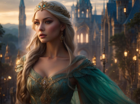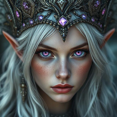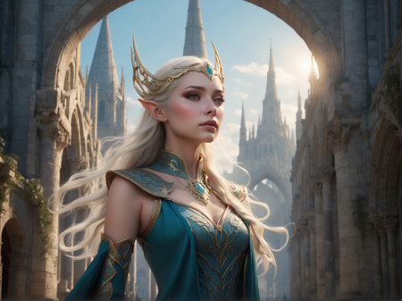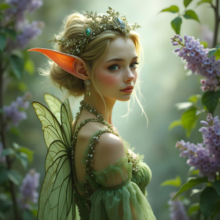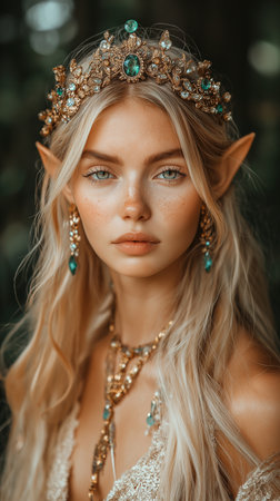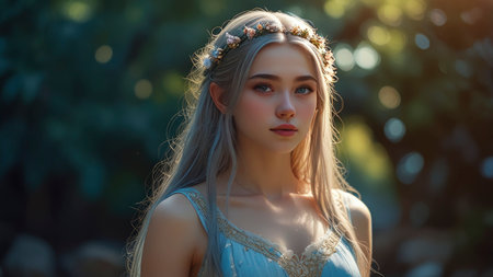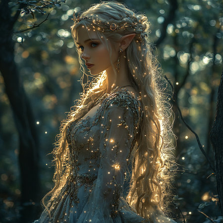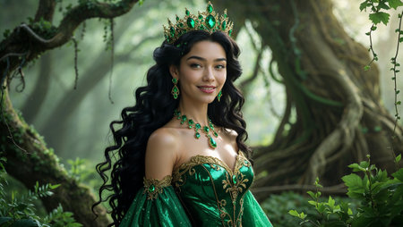 A delicate elven princess with silver hair and a flowing emerald gown, standing in an enchanted forest, Ai created image