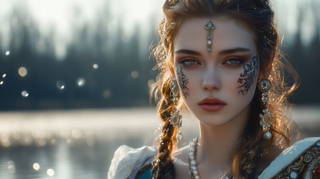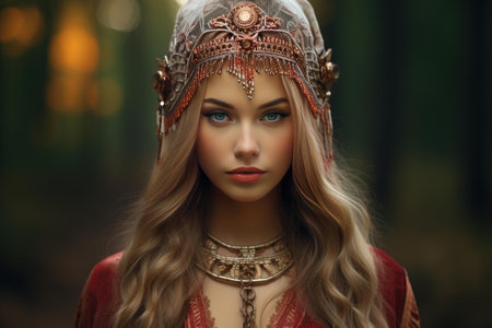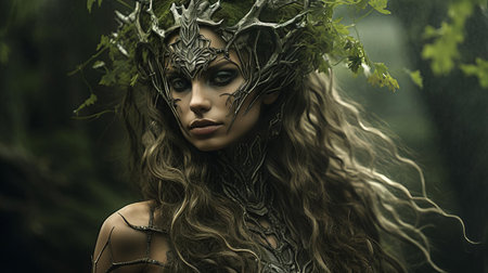 Portrait of a enigmatic beautiful girl posing in a forest. Beauty, fashion. Cosmetics and makeup.