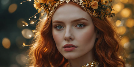 Close-up portrait happy red-haired woman queen in golden crown on head looking at camera. Girl joyful cheerful princess smiling face, green renaissance victorian dress. Red lips pale skin long hair