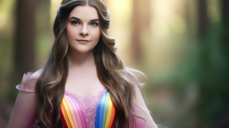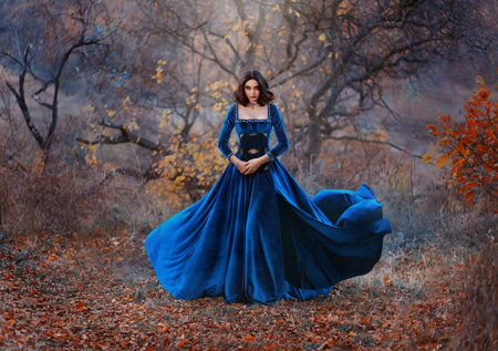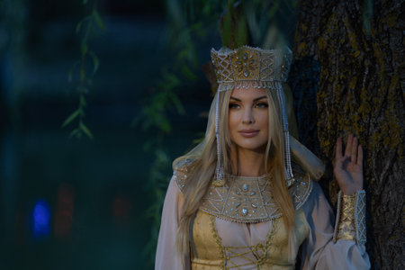 A beautiful medieval queen stands in a dark dense forest with the sunlight breaking through the branches of the trees. Ancient legends. Fantasy world. Copy space.