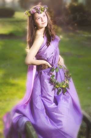 A young girl poses in lilac with a beautiful hairstyle of flowers and butterflies.