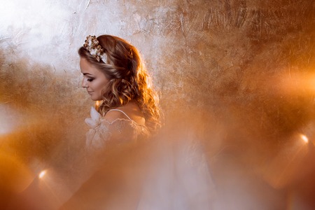Beautiful girl bride in a luxurious wedding dress, portrait in Golden tones, the effects of glare