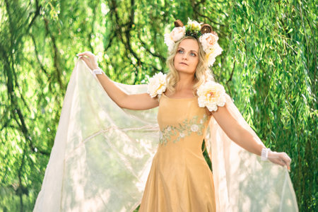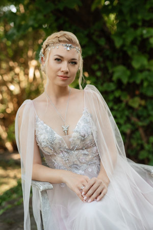 portrait of a happy bride in a light dress on a green meadow in the park wearing elven accessories