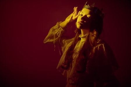 Princess from fairy-tale. Portrait of a beautiful proud medieval princess. Dark red studio background. Fantasy.