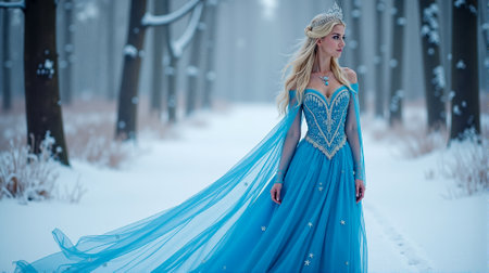 Art photo. Fantasy young woman fairy elf in blue cape with hood stands in cold wind. Winter nature background, white snow. Girl Queen walks in medieval dress, silk cloak, fabric is waving, fluttering