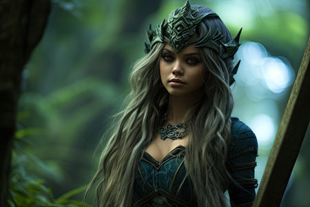 Divine female warrior valkyrie holds a sword in her hand in a forest lit by sunlight. Scandinavian mythology. Epic fantasy.