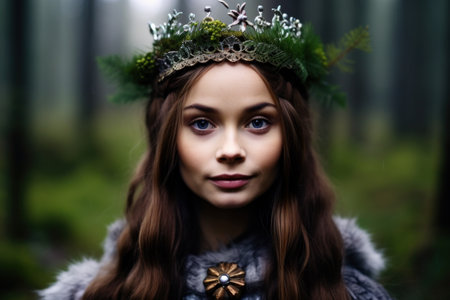 Elf Fairy woman. Close up portrait of an elf girl. Cold snowstorm in winter.
