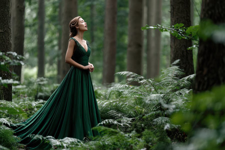 A woman wearing an elegant green gown stands amidst tall trees and vibrant ferns, embracing the tranquility of nature.