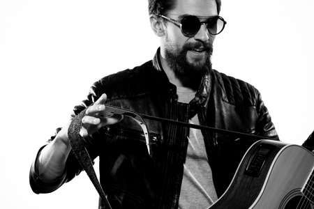 A man holds a guitar in his hands music emotions black leather jacket dark glasses studio light background