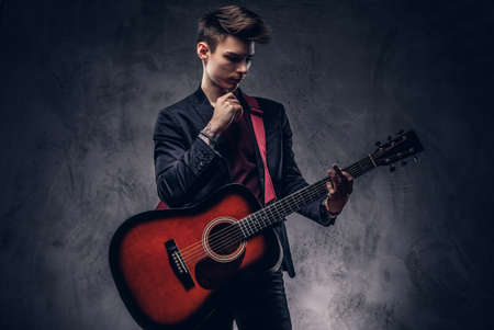 Handsome young thoughtful musician with stylish hair in elegant clothes posing with a guitar in his hands.