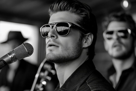 Close up of a male singer wearing sunglasses performing with microphone on stage with his band in black and white